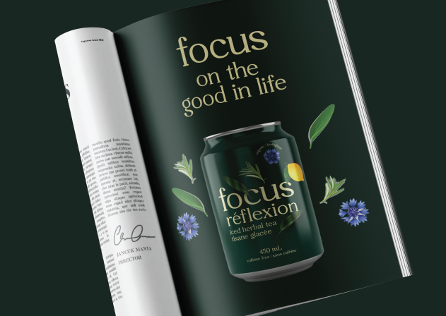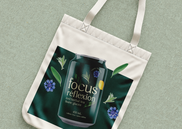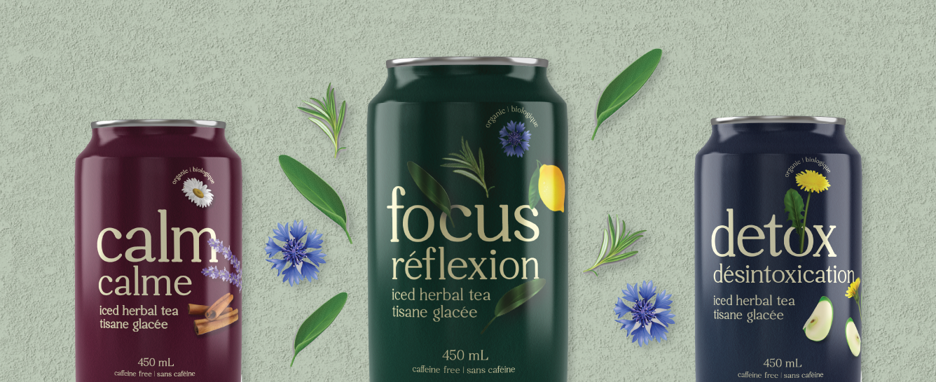 The client was looking for an ingredient focused design that also showcased the benefits of their iced tea for the consumer. The packaging had to have a very natural and approachable look to it. The beige colour used for the font adds to the natural look and feel. The design makes it easy to tell what ingredients are in the product as well as the health benefits for the consumer. With the ingredients “jumping off” the can, it helps to highlight the bold flavours of the iced teas. These bold and punchy designs will stand out to the busy mom’s who are looking to gain some focus and feel more grounded in their day to day lives.